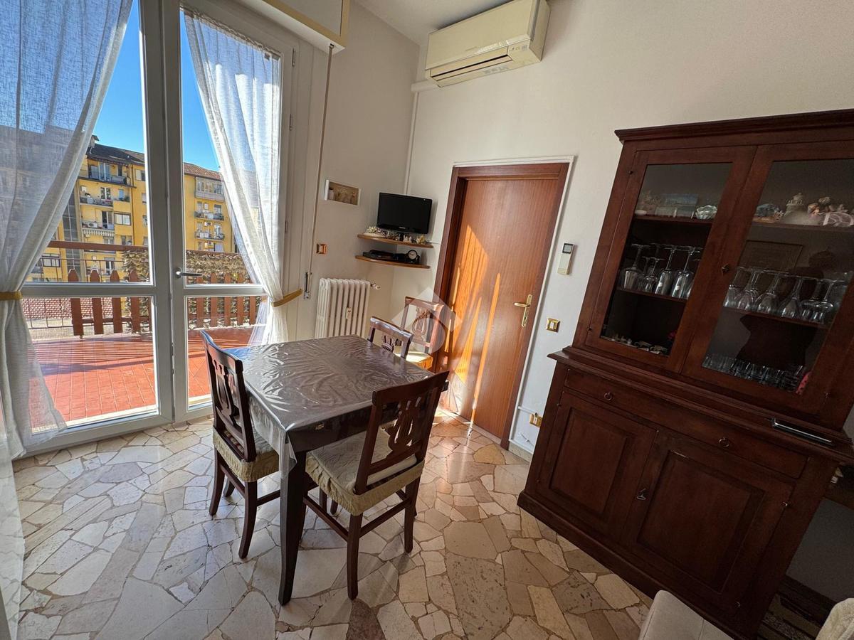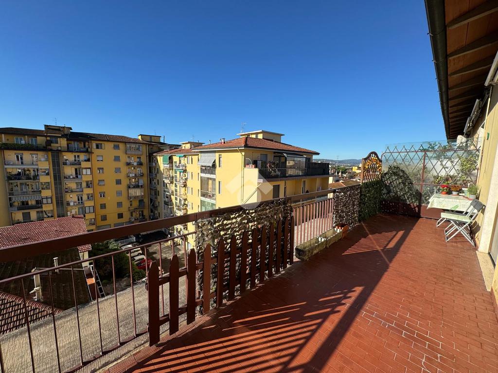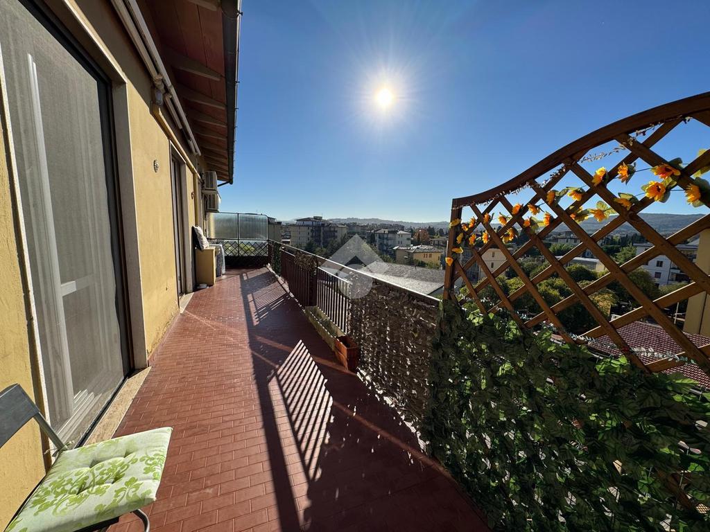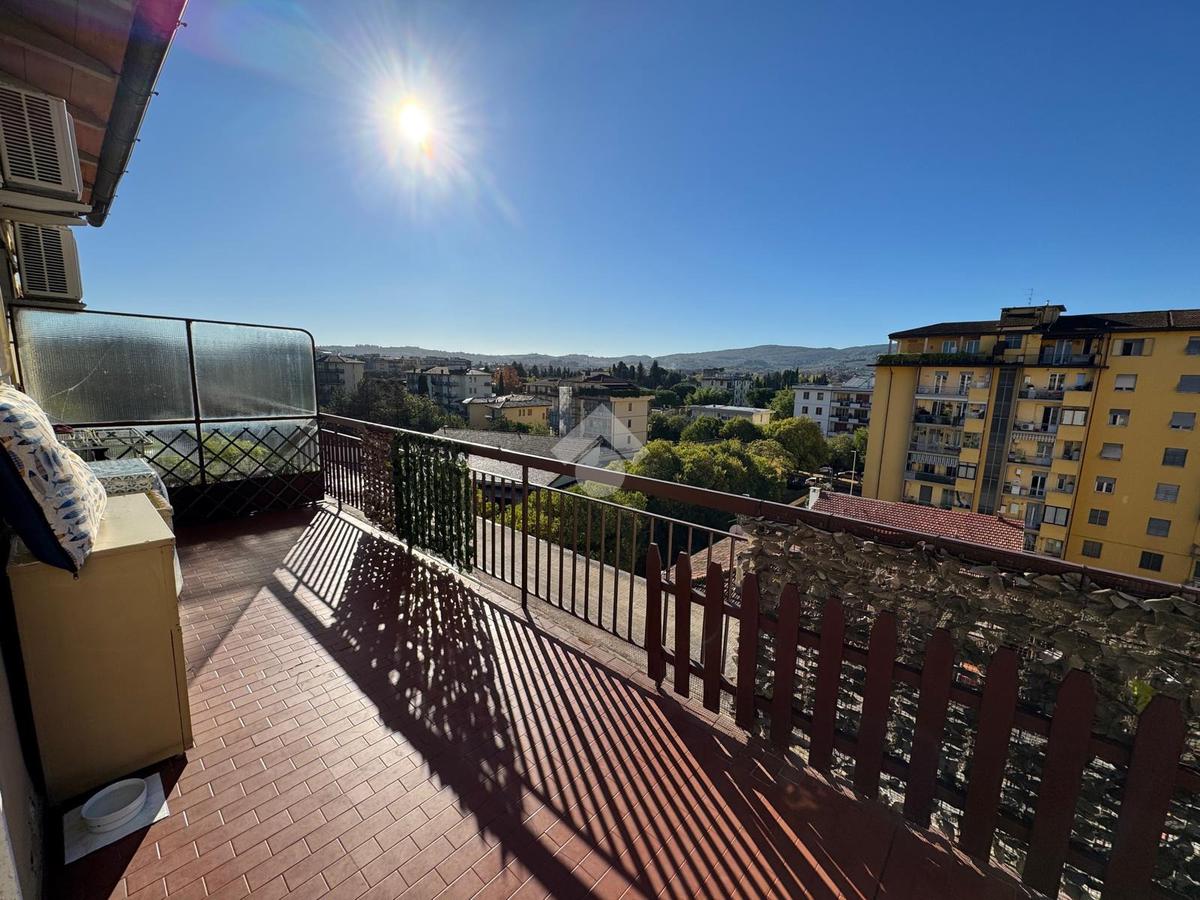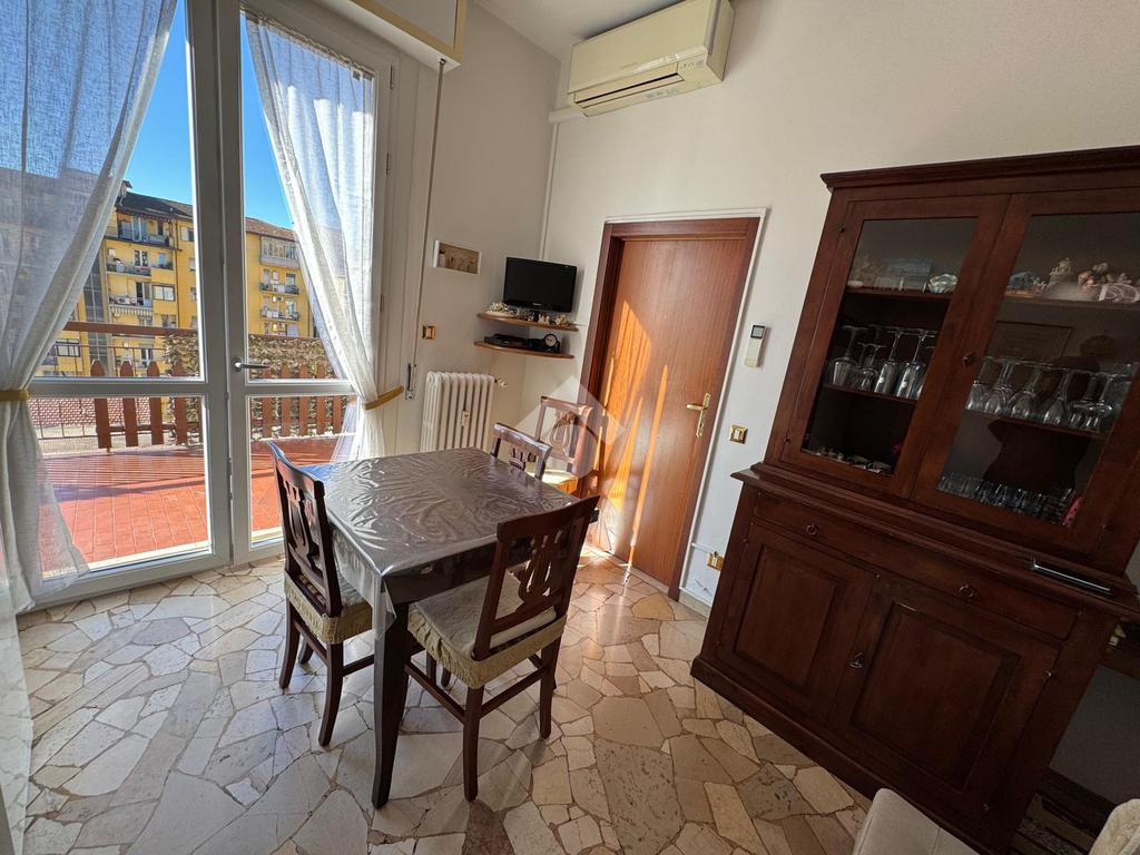 L’ingresso si apre su un disimpegno lungo e funzionale che conduce ai vari ambienti della casa. Il bagno, finestrato e dotato di box doccia, è pratico e ben rifinito. La zona giorno, composta da cucina e soggiorno, risulta ariosa e luminosa grazie alle ampie porte finestre che permettono l’accesso diretto alla splendida terrazza abitabile — il vero punto di forza dell’immobile. Questo spazio esterno, ampio e soleggiato, regala una vista aperta sul verde e sui tetti circostanti, offrendo la possibilità di godere momenti di relax, pranzi e cene all’aperto o semplicemente di respirare un’atmosfera tranquilla e luminosa.
