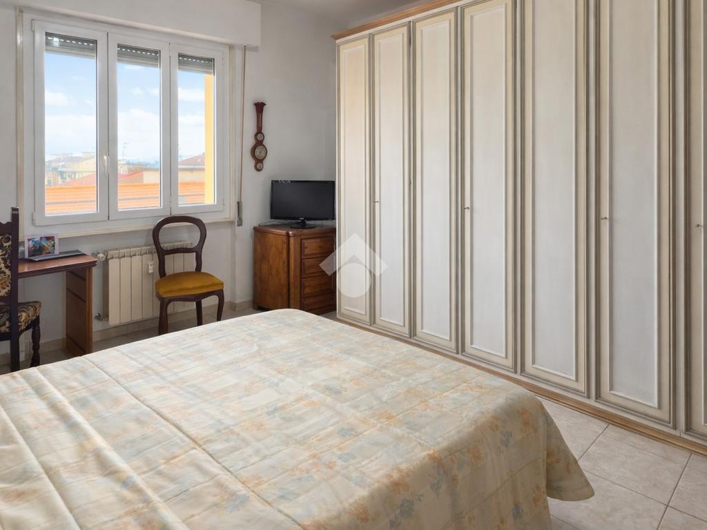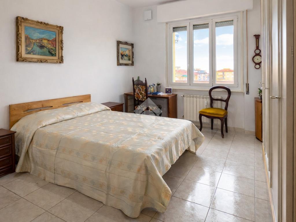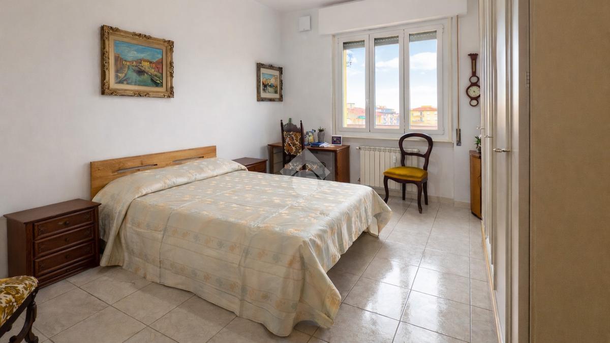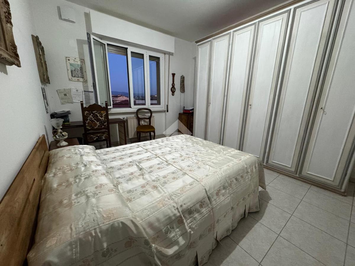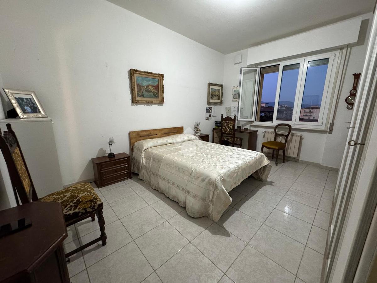 La zona notte ospita una spaziosa camera matrimoniale, silenziosa e luminosa, con una grande finestra che apre la vista sui tetti e sulle colline circostanti. L’atmosfera è tranquilla e rilassante, ideale per chi cerca un rifugio accogliente dopo una giornata di lavoro.
